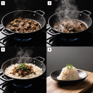 Enquanto a carne seca refoga, prepare o arroz. Em outra panela, coloque óleo e doure o arroz até ficar levemente tostado. Depois, adicione água ou caldo de carne e cozinhe até ficar no ponto.